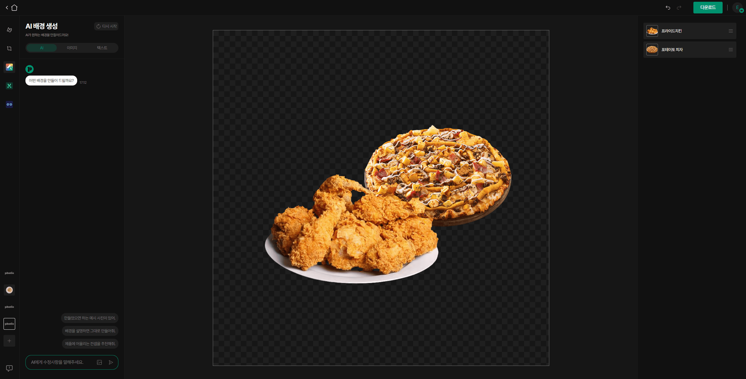 이 케이스는 굉장히 간단한 방법으로 제작 가능합니다. 포티오에 세트메뉴 이미지를 업로드하고, AI가 누끼를 제대로 땄는지만 확인하면 됩니다. 누끼 이미지 수정 방법은 관련 아티클 2번에 상세하게 나와있으니 참고해주세요.
