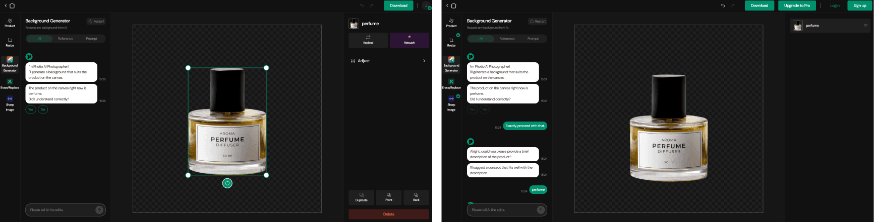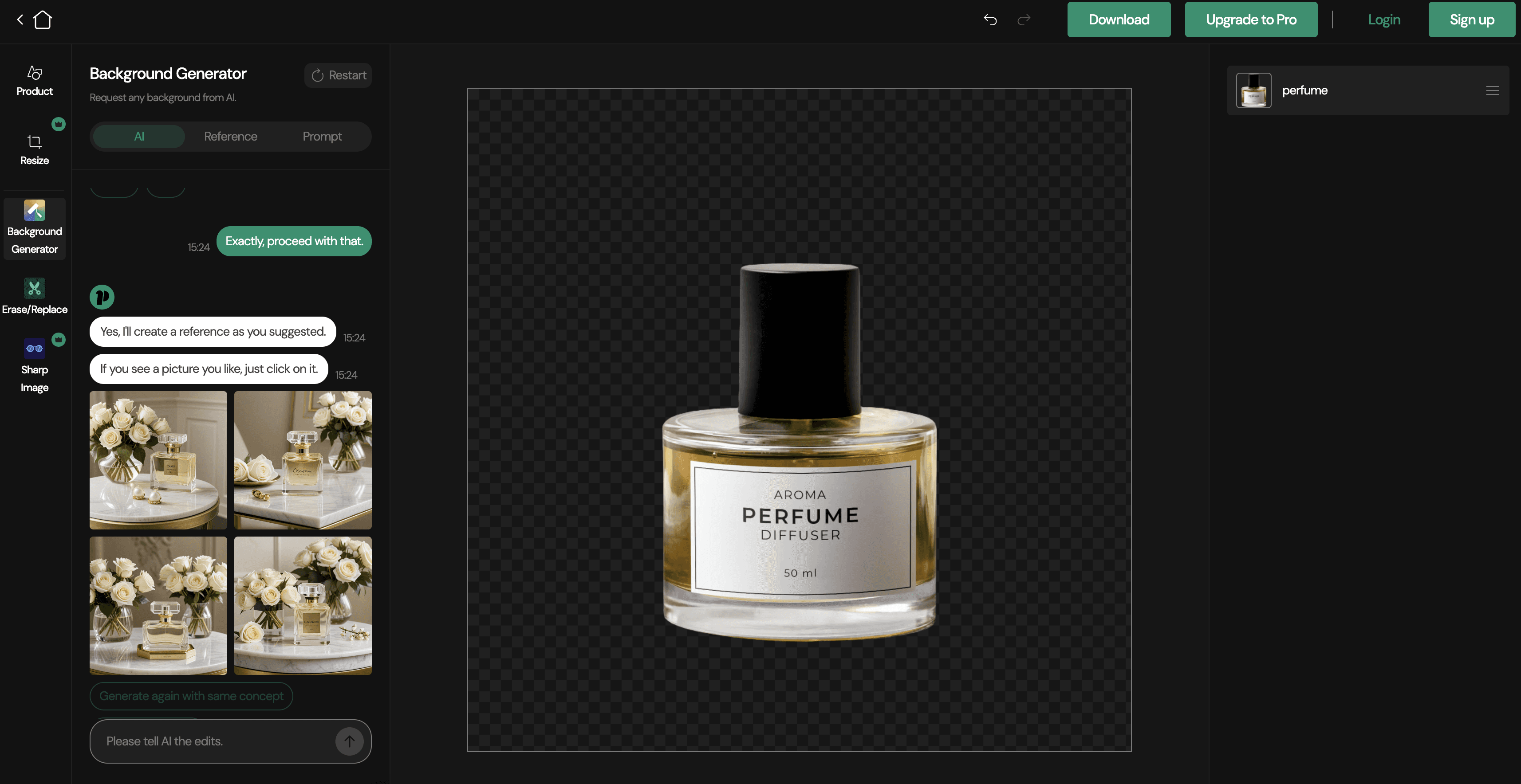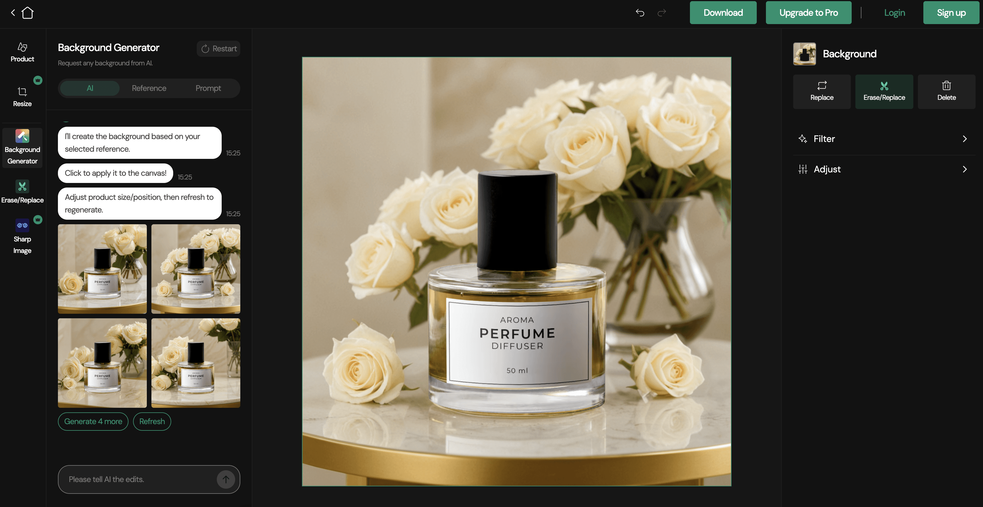 After the background is removed, the AI suggests or generates new backgrounds that complement the product. You can select from pre-designed templates or let the AI create a custom background based on your input. The AI ensures that the new background integrates seamlessly with the product, enhancing its visual appeal.